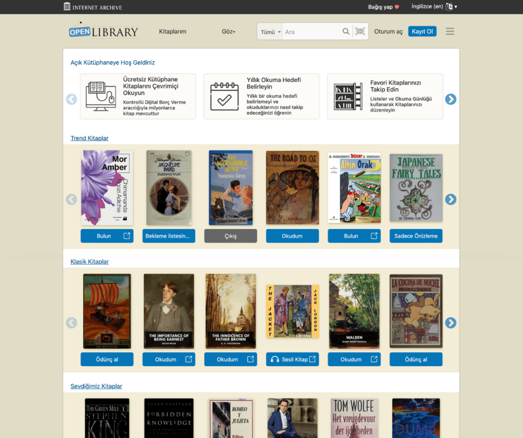 Internet Archive bünyesinde yer alan bu dijital kütüphane, “dünyadaki her kitabın herkes için ulaşılabilir olma” mottosuyla 2006 yılında, hiçbir ticari kaygı güdülmeden ücretsiz bir platform olarak kuruldu. Hâlen klasik eserlerden eski baskılara, akademik kitaplardan çocuk kitaplarına hatta artık basımı olmayan eserlere kadar çok farklı türde içeriğe erişebiliyorsunuz.