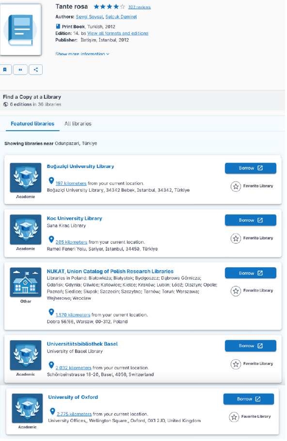 Örneğin Sevgi Soysal’ın “Tante Rosa” eseri (ki çok severim, okumadıysanız muuutlaka okuyun.) Boğaziçi ve Oxford Üniversiteleri dahil birçok kütüphanede mevcut görünüyor. Bkz.